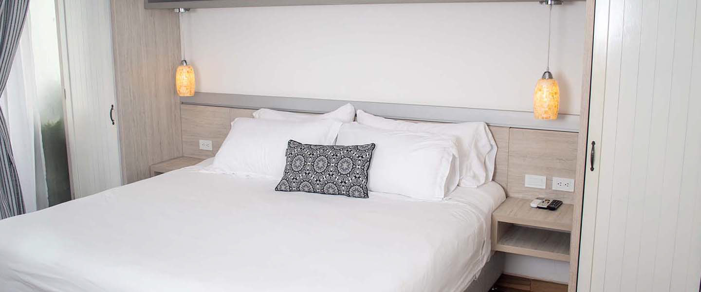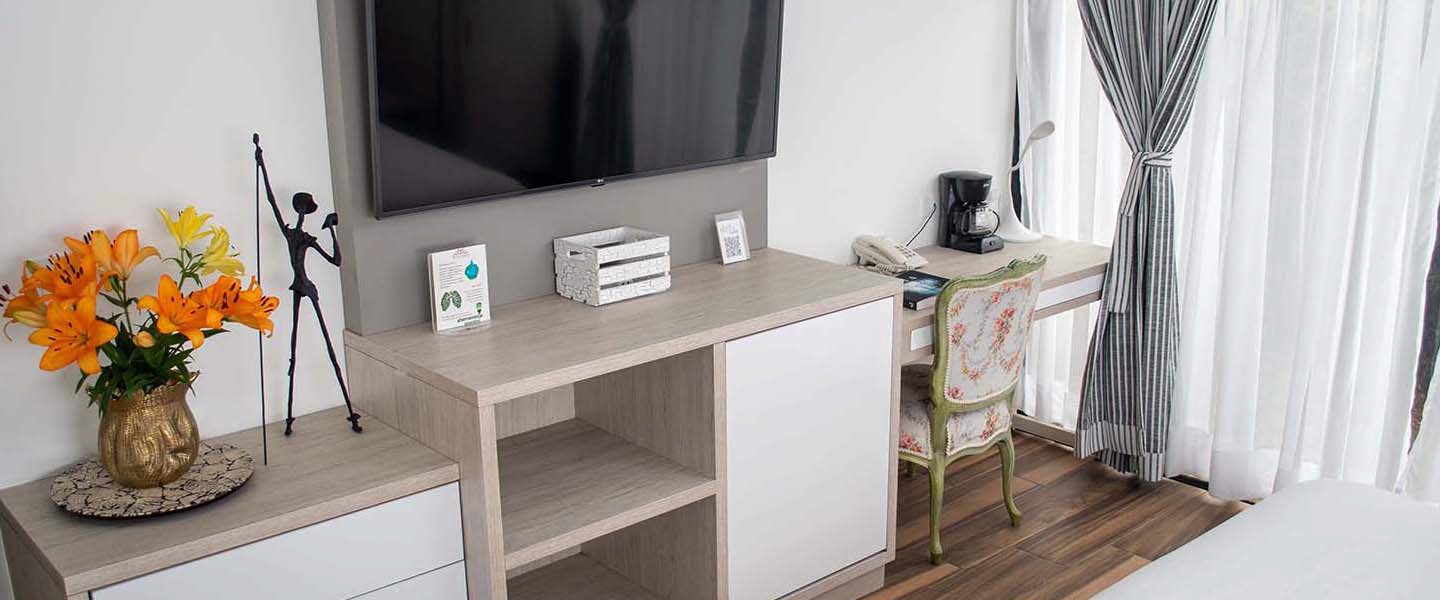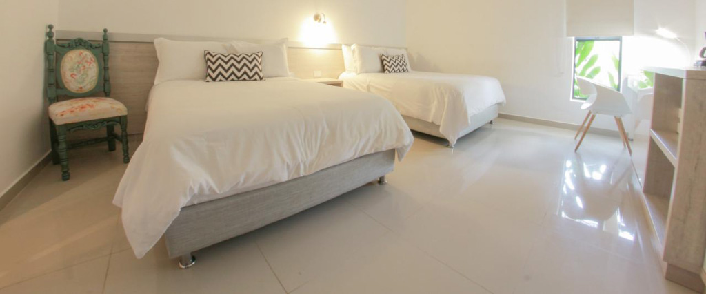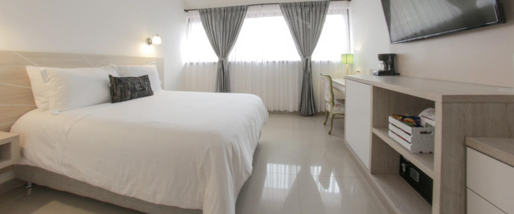 Todas las habitaciones cuentan con baño privado, televisor, closet con caja fuerte, escritorio, mini nevera y cafetera, e Incluyen desayuno tipo americano para los huéspedes.